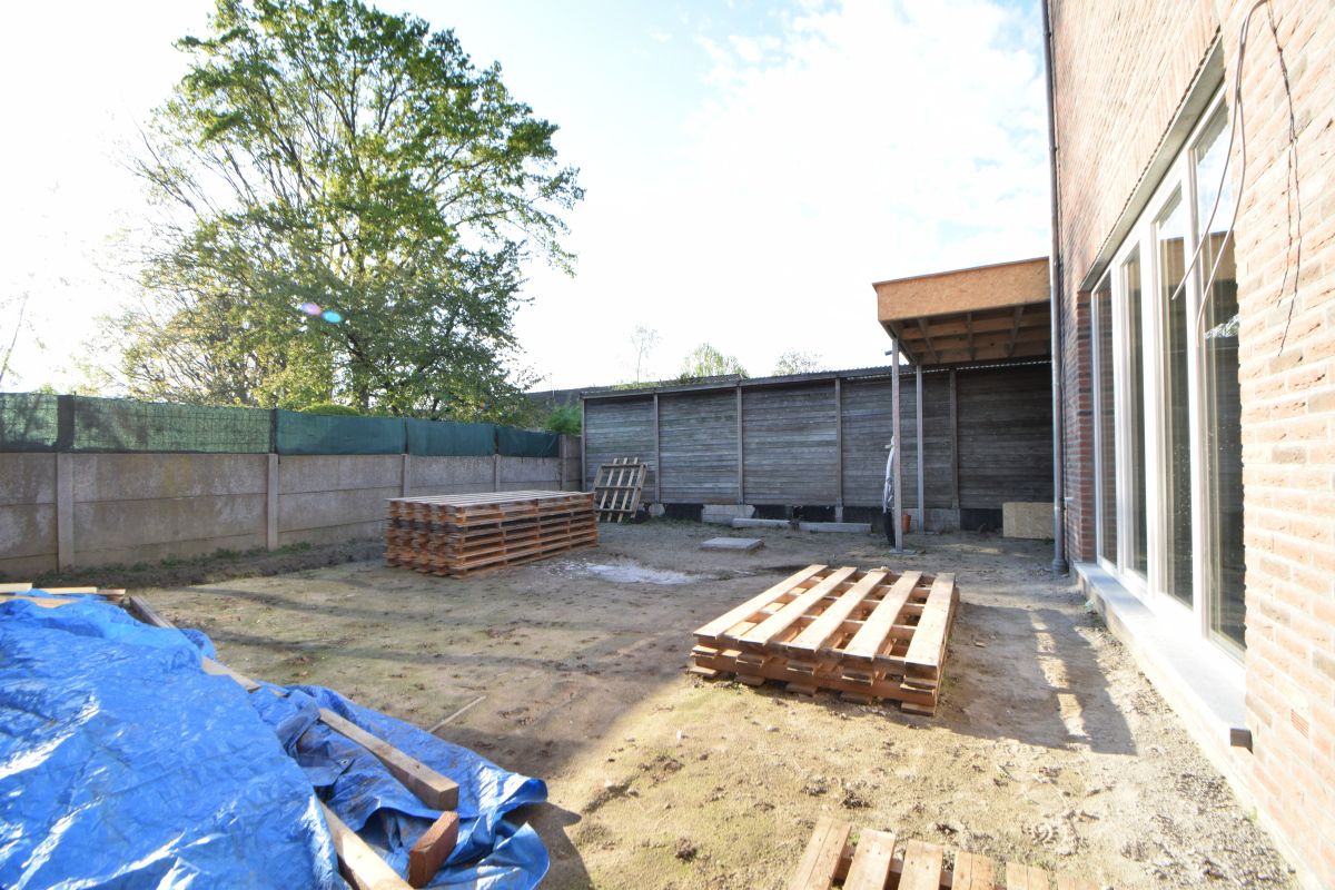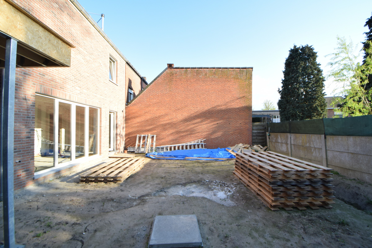 De tuin wordt onderhoudsvriendelijk aangelegd, rechts van de woning is er een carport met fietesen/ tuinberging geplaatst.