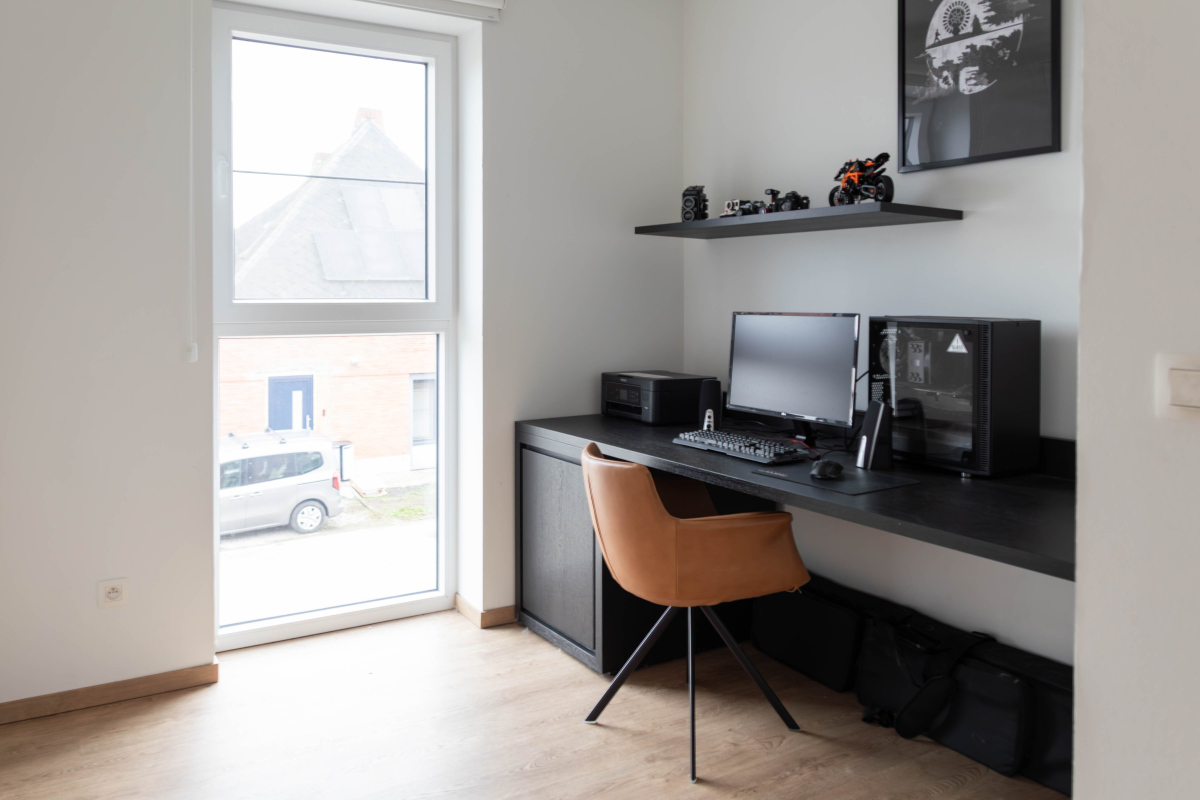 Achteraan bevinden zich twee ruime slaapkamers, waarvan één voorzien van een ingemaakte kastenwand. De moderne badkamer is uitgerust met een regendouche en stijlvol lavabomeubel. Verder is er een apart gastentoilet en een praktische berging met ingemaakte kasten voor wasmachine en droogkast. Hier zijn ook de condenserende HR-gasketel en het ventilatiesysteem D ondergebracht.