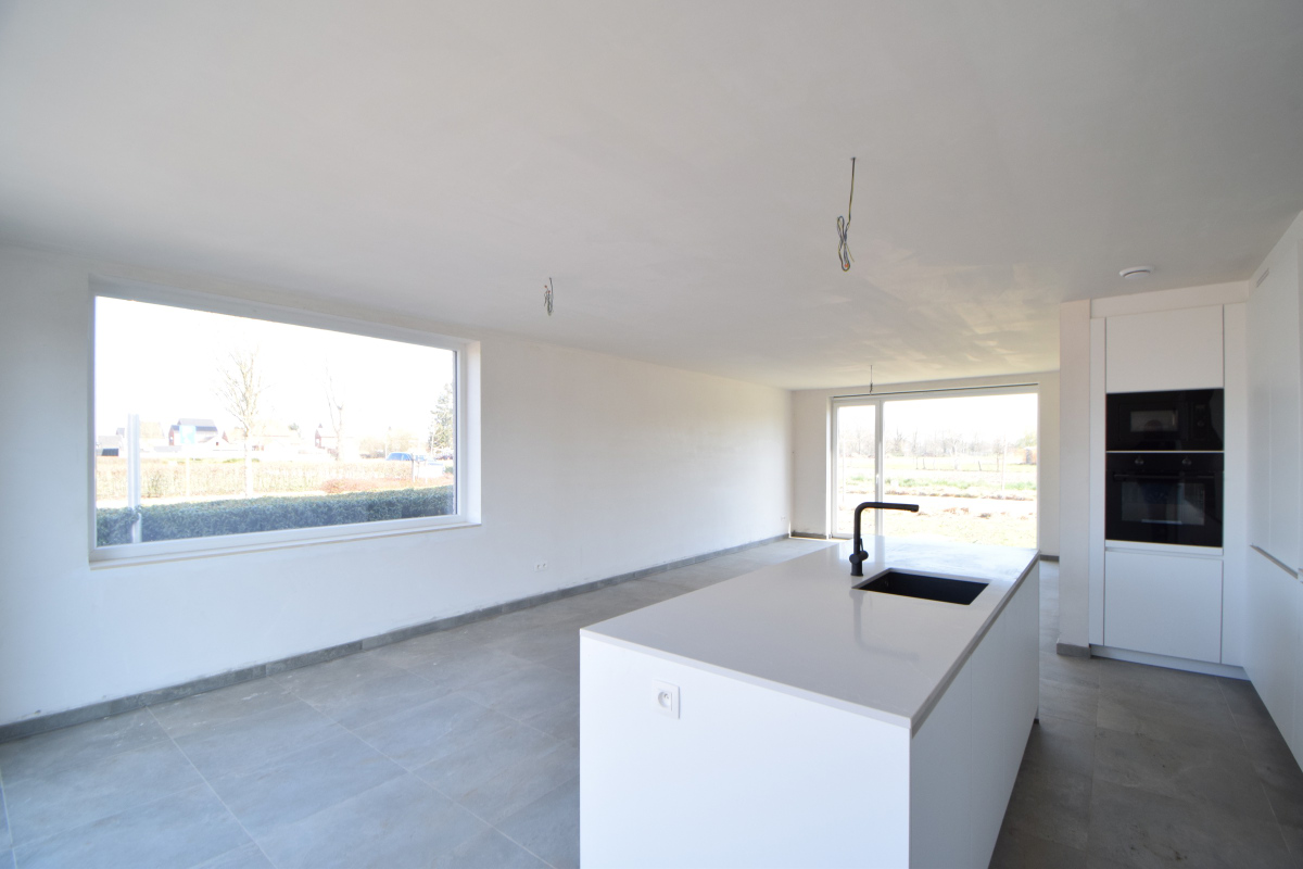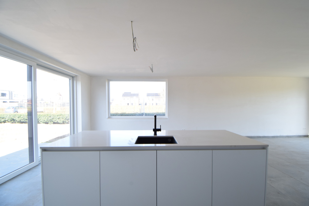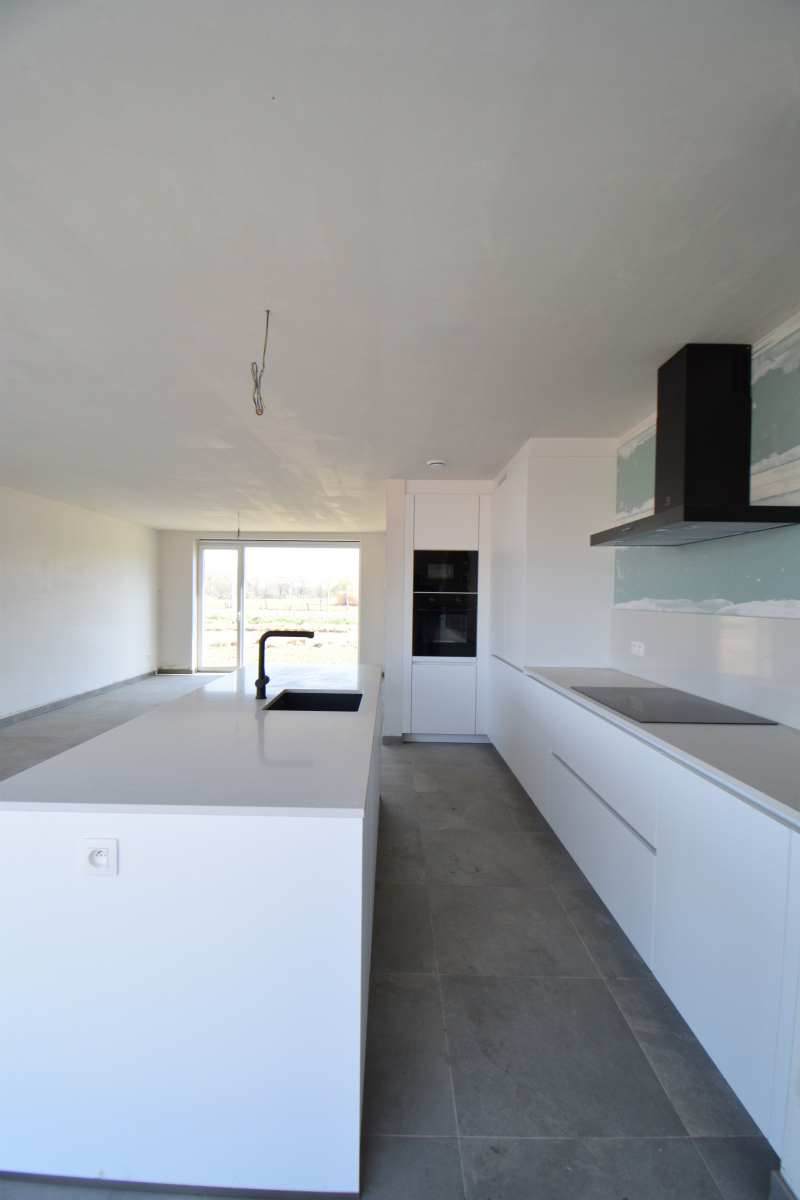 De open keuken met eiland is volledig ingericht en voorzien van alle comfort: inductiefornuis, vaatwasser, combi-oven, spoelbak, inbouwijskast, en voldoende kastruimte. Aanpalend is er een ruime berging met aansluiting voor wasmachine- en droogkast.