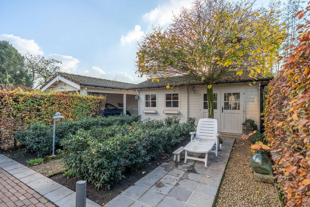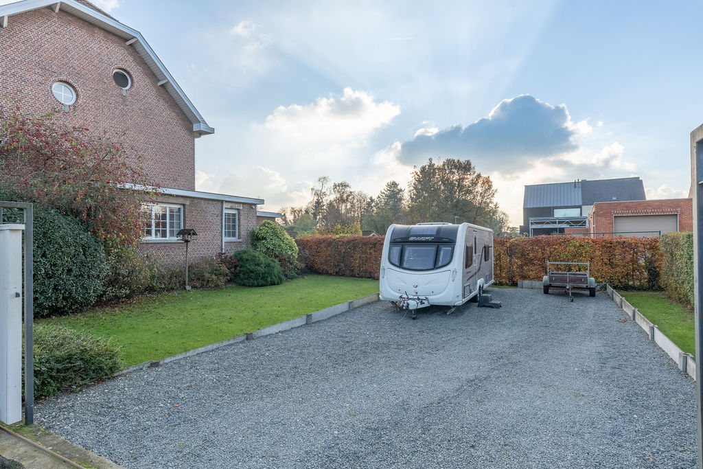 De tuin is afgesloten met een elektrische poort en achteraan in de tuin staat een carport en tuinhuis.