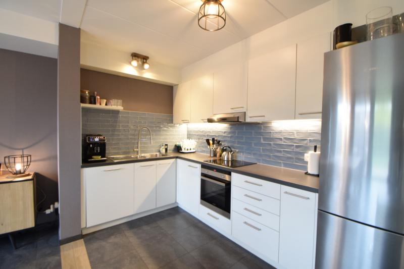 Ter hoogte van de keuken is er een dubbele achterdeur die uitgeeft op het terras en de omheinde, onderhoudsvriendelijke tuin met achterpoortje. Een zonneluifel zorgt voor extra comfort op warme dagen en de tuinberging biedt handige opbergruimte.