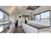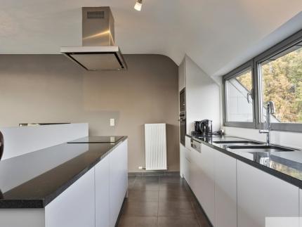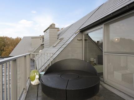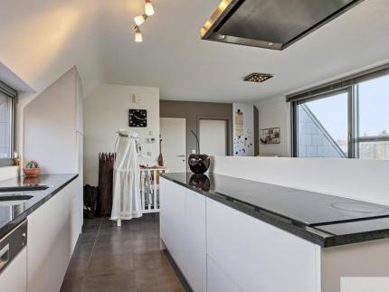 Het dakappartement (95 m²) bestaat uit een ruime traphal die uitgeeft op een mooie leefruimte met veel lichtinval en een open keuken met eiland. De keuken is volledig ingerichte met fornuis, afzuigkap, inbouwijskast, microgolf, oven en vaatwasser.