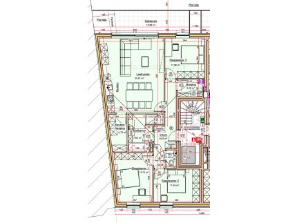 | Living | 33,91 mē | Leefruimte met open keuken en eet- en zithoek. De leefruimte geeft via een schuifraam uit op het dakterras achteraan. |