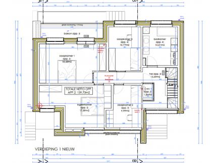 De eerste verdieping bestaat uit een nachthal die uitgeeft op de badkamer. Deze bestaat uit een badkamermeubel met twee lavabos, ligbad, douche en aansluiting voor wasmachine en droogkast. Verder zijn er 4 ruime slaapkamers waarvan 1 grote slaapkamer met terras achteraan, 2 slaapkamers zijn tevens voorzien van een dressing. Op de gang is er een apart toilet met handenwasser.