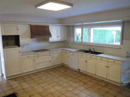 Ruime woning met 4 slaapkamers op een perceel van 2.077mē.De woning bestaat uit een inkomhal met vestiaire die uitgeeft op de leefkeuken en de ruime woonkamer.