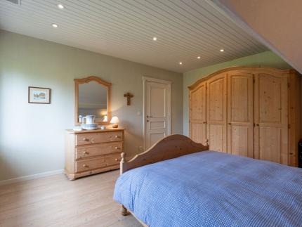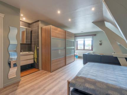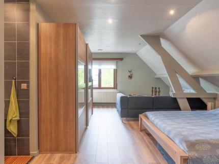 Boven zijn er 3 ruime slaapkamers, twee slaapkamers vooraan en een master bedroom achteraan met aanpalend een zeer ruime badkamer met dubbel lavabomeubel, grote inloopdouche en toilet. Verder is er nog een kinderkamer en een linnenkamer.