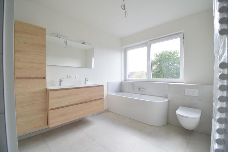 Badkamer 1 | 8,99 m˛ | Badkamer met dubbel lavabomeubel, ligbad, toilet en grote inloopdouche. |