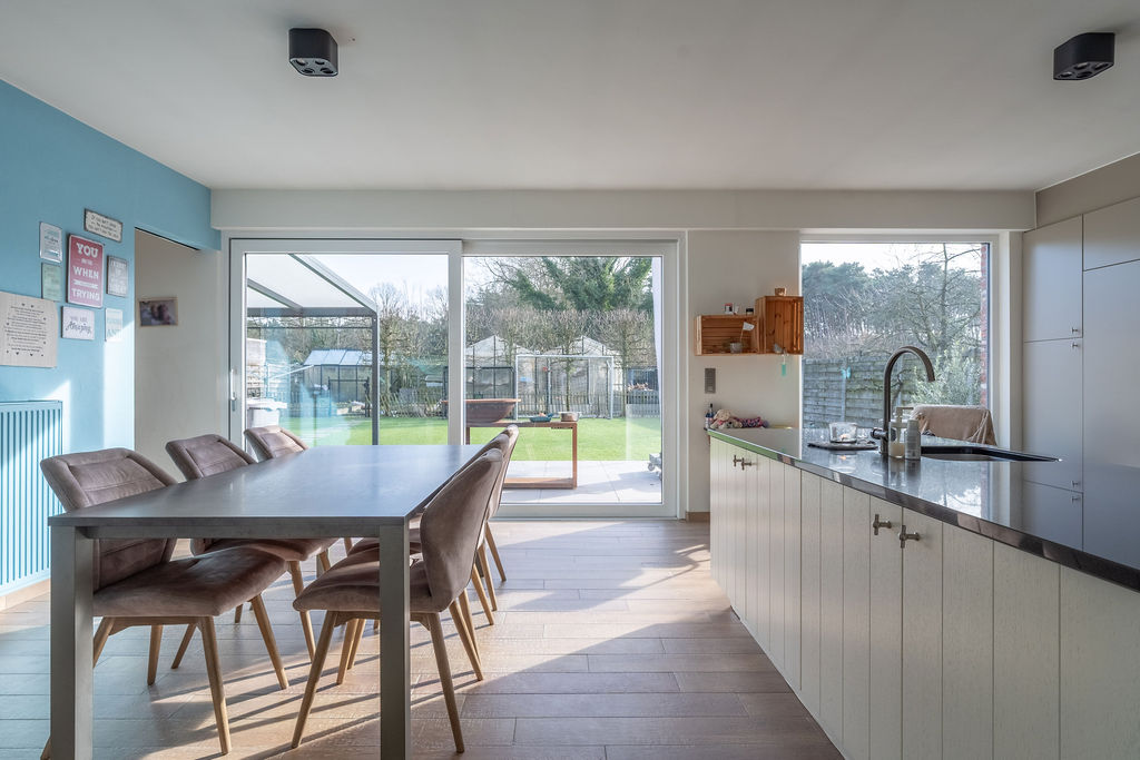 | Keuken 1 | 22,50 mē | Leefkeuken bestaande uit een eethoek en een volledig ingerichte keuken met pompsteen, afzuigkap, gasfornuis, micro-golf, oven, stoomoven, inbouwijskast. De keuken geeft via een schuifraam uit op het terras en de tuin. |