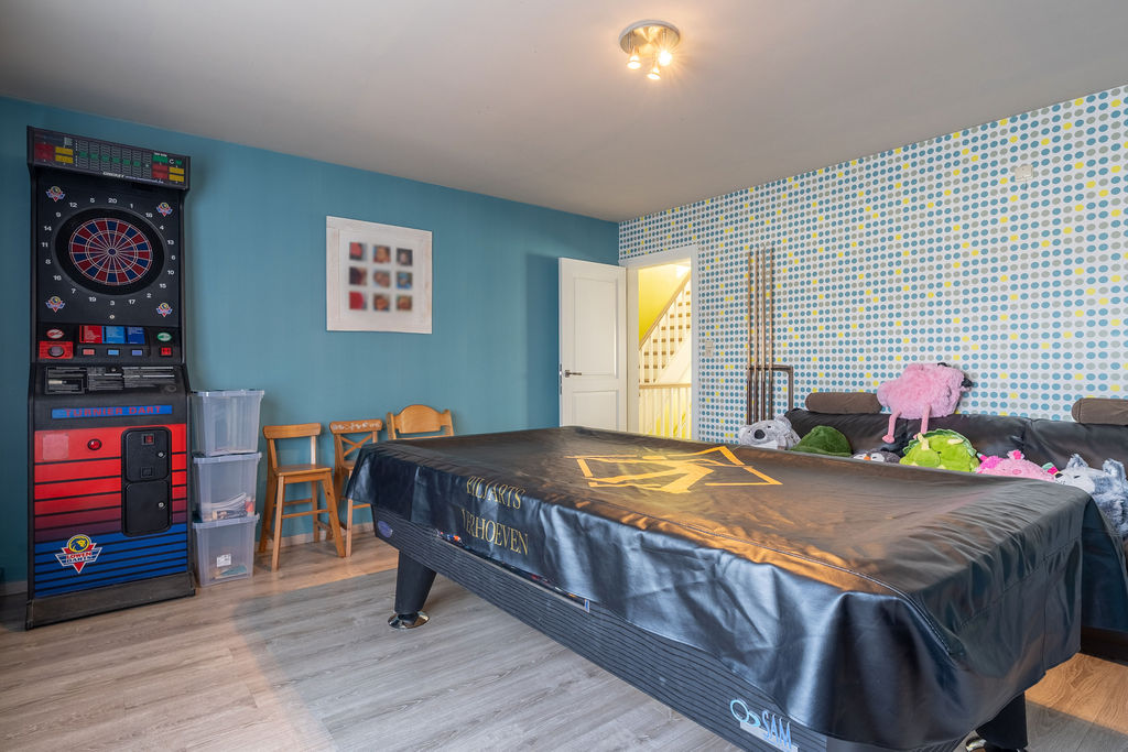 De indeling is als volgt: Inkomhal met aanpalend een bureauruimte (eventueel 7de slaapkamer), de inkomhal geeft uit op de leefruimte bestaande uit een zitplaats vooraan en aanpalend een zithoek met aansluiting voor een houtkachel. De zithoek geeft uit op de leefkeuken achteraan met zicht op de tuin. De leefkeuken bestaat uit een ruime volledig ingerichte keuken, eethoek en een 2de zithoek/ speelkamer. Keuken en speelkamer geven uit op een groot terras (deels overdekt) en de tuin. Verder is gelijkvloers een badkamer met dubbel lavabomeubel en grote inloopdouche, een kleine wasruimte en een grote inpandige garage.