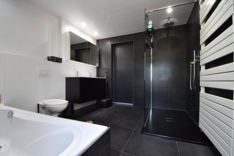 Achteraan de woning is er een badkamer met ligbad, grote inloopdouche, dubbel lavabomeubel en toilet en aanpalend een wasruimte.