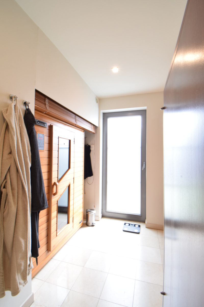 Achteraan de villa geeft de nachthal uit op een apart toilet, de masterbedroom met dressing/ kastenwand en zicht op de tuin en de badkamer met lavabomeubel, grote inloopdouche en sauna.