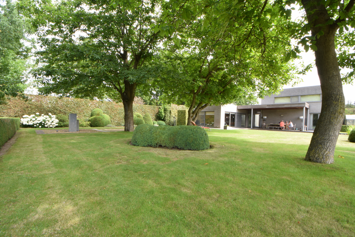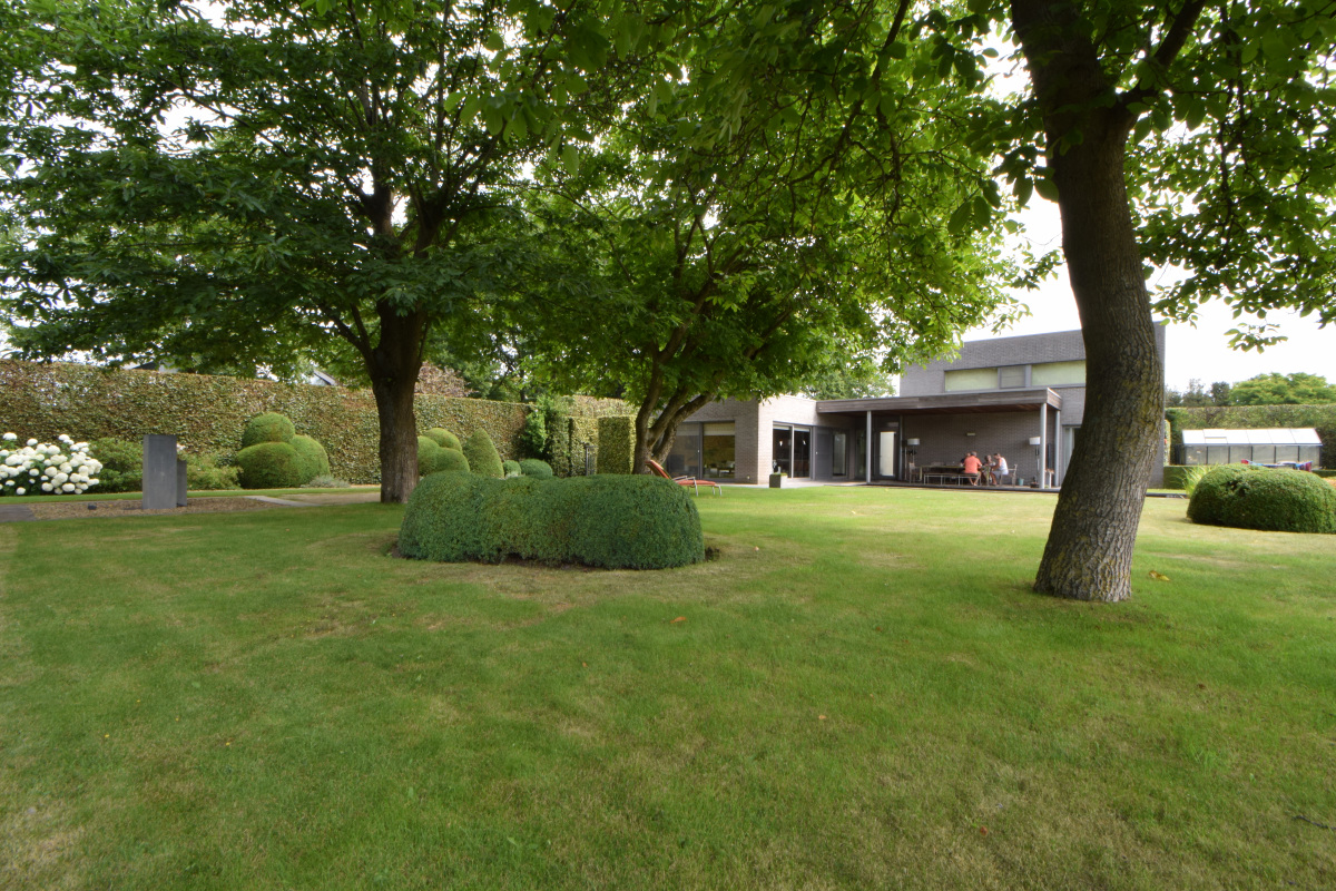 Buiten is er een groot overdekt terras met vijverpartij en een prachtige tuin met majestueuze notenbomen en een kastanjeboom en een petanquebaan. Achteraan is er nog een groot bos. Aan de voorzijde van de villa is er een carport met tuinhuis. De tuin is volledig afgesloten.