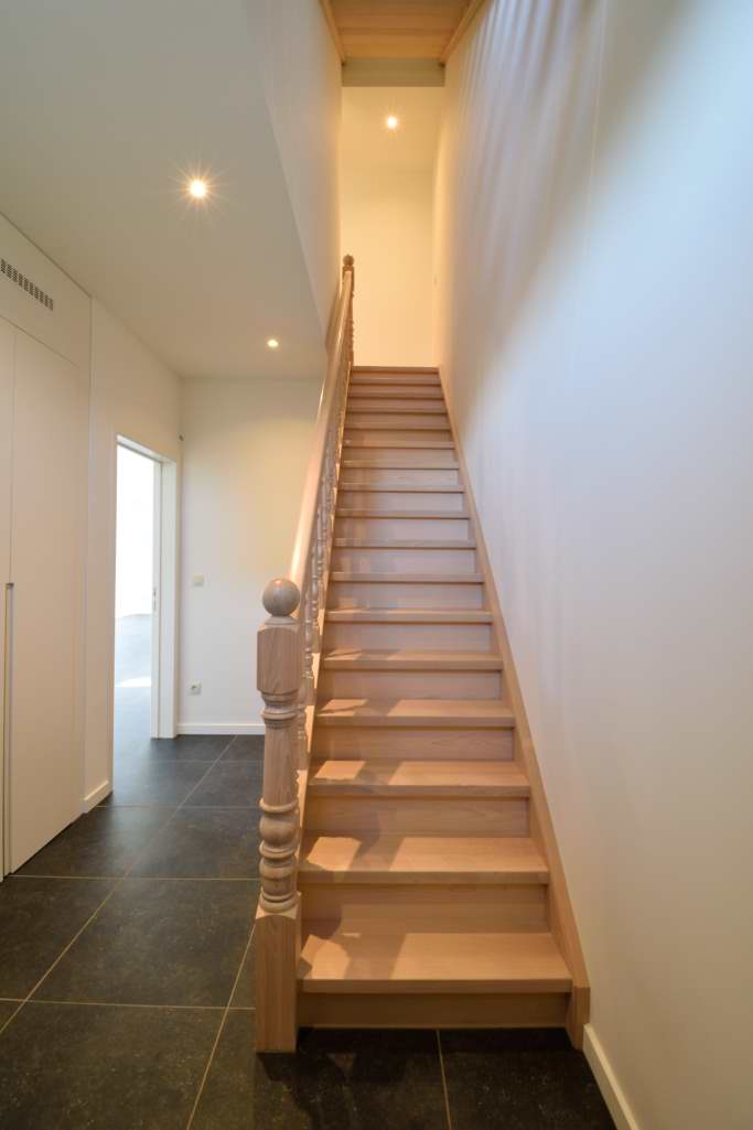 Indeling: inkomhal met gastentoilet en rechte houten trap naar de bovenverdieping, een ruime leefruimte met aan de straatzijde een bureau, een zithoek, eethoek en achteraan een volledig geïnstalleerde open keuken met eiland en aanpalend een berging/wasplaats. De woonkamer en keuken geven uit op de knusse tuin achteraan.