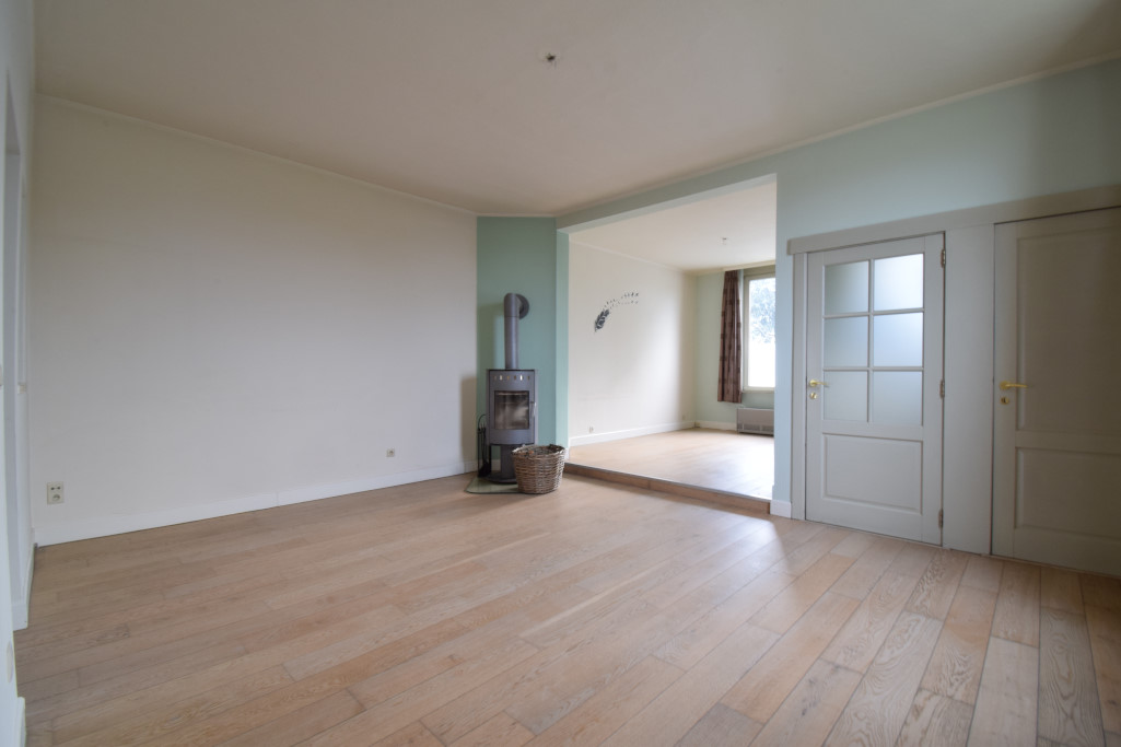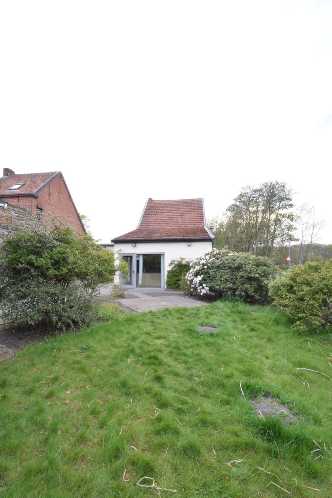 Charmante vrijstaande woning met 3 slaapkamers en grote tuin met zwembad.De woning bestaat uit een inkomhal met rechte trap naar de verdieping. De inkomhal geeft uit op de leefruimte bestaande uit zit- en eethoek en achteraan een keuken met zicht op de tuin.