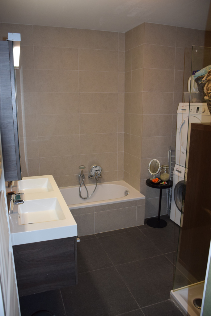 De mooie badkamer bestaat uit een ligbad, grote inloopdouche, badkamermeubel met lavabo en opbergkast.
