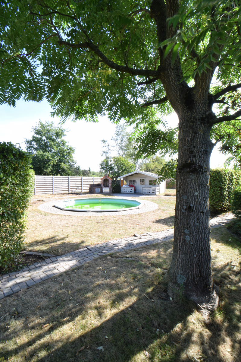 Achter de woning is er een volledig omheinde tuin met een te renoveren zwembad en tuinhuis, volledig achteraan is er nog een gedeelte tuin waar een berghok is geplaatst, de tuin is potentieel interessant voor een moestuin, kippen, .