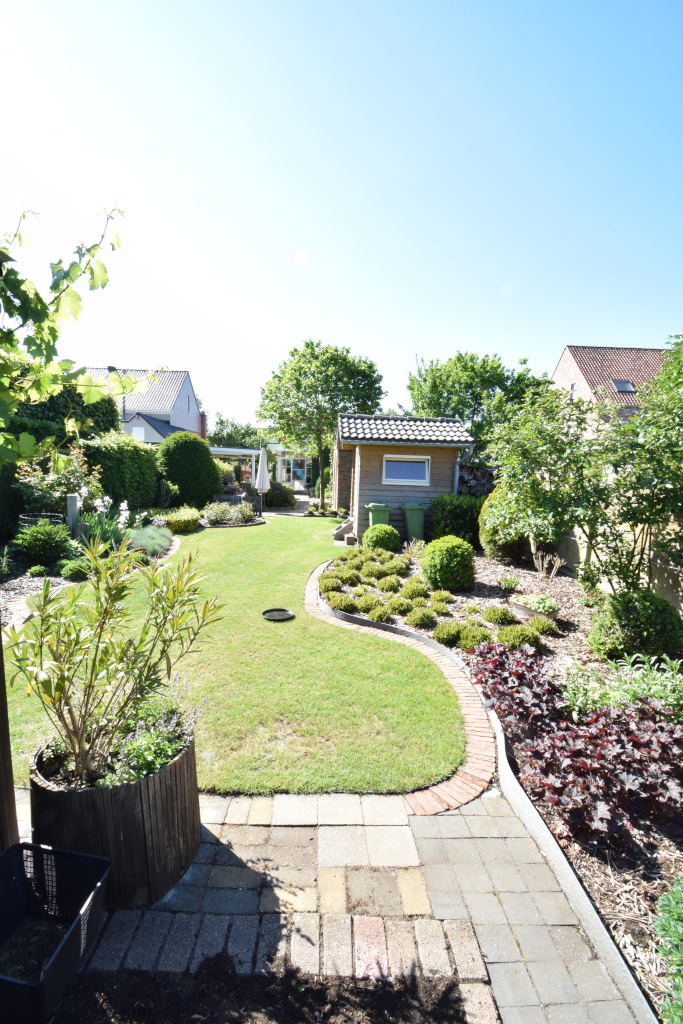 Achter de woning is er een volledig aangeplante noordgerichte tuin van 550 m² die ook langs achter bereikbaar is met de wagen.