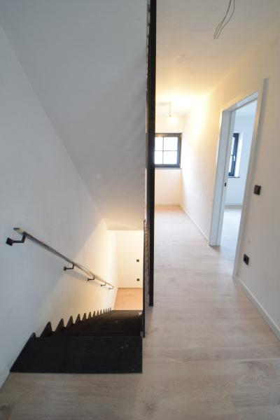 Op de eerste verdieping zijn er 3 slaapkamers: twee ruime slaapkamers met veel lichtinval en een master bedroom met mogelijkheid tot een aangrenzende dressing. Achteraan bevindt zich een mooi afgewerkte badkamer met ligbad, grote inloopdouche, dubbel lavabomeubel en toilet.