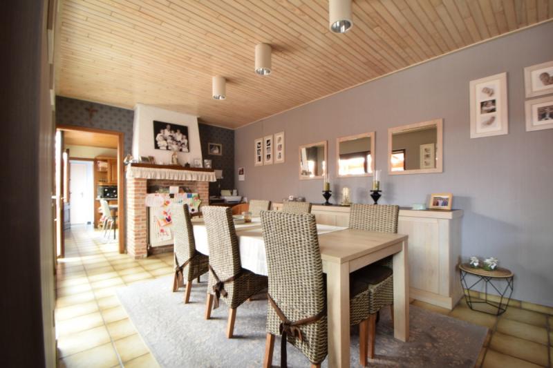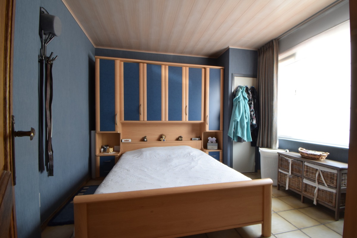 Charmante woning met 3 slaapkamers, grote garage/ werkhuis en tuin van 665mē.De woning bestaat gelijkvloers uit een inkomhal met aanpalend een slaapkamer aan de voorzijde. De inkomhal geeft uit op de leefruimte met houtkachel en eetkamer. Aansluitend is er een ingerichte keuken met ontbijthoek.