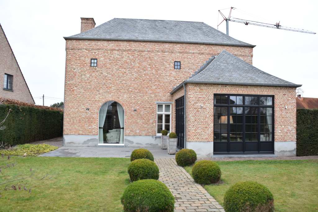 | Bevloering | Bourgondische natuursteen in Romeins verband in de inkomhal, wasplaats, keuken en eetkamer en vol eikenhouten parket in de woonkamer bureau en op de 1ste en 2de verdieping. |