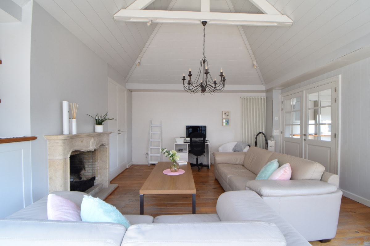 Aansluitend aan de open keuken is er een mooie eetkamer die uitgeeft op een grote zithoek met massief houten parket vloer, natuur stenen inbouwhaard en ingemaakte kasten.