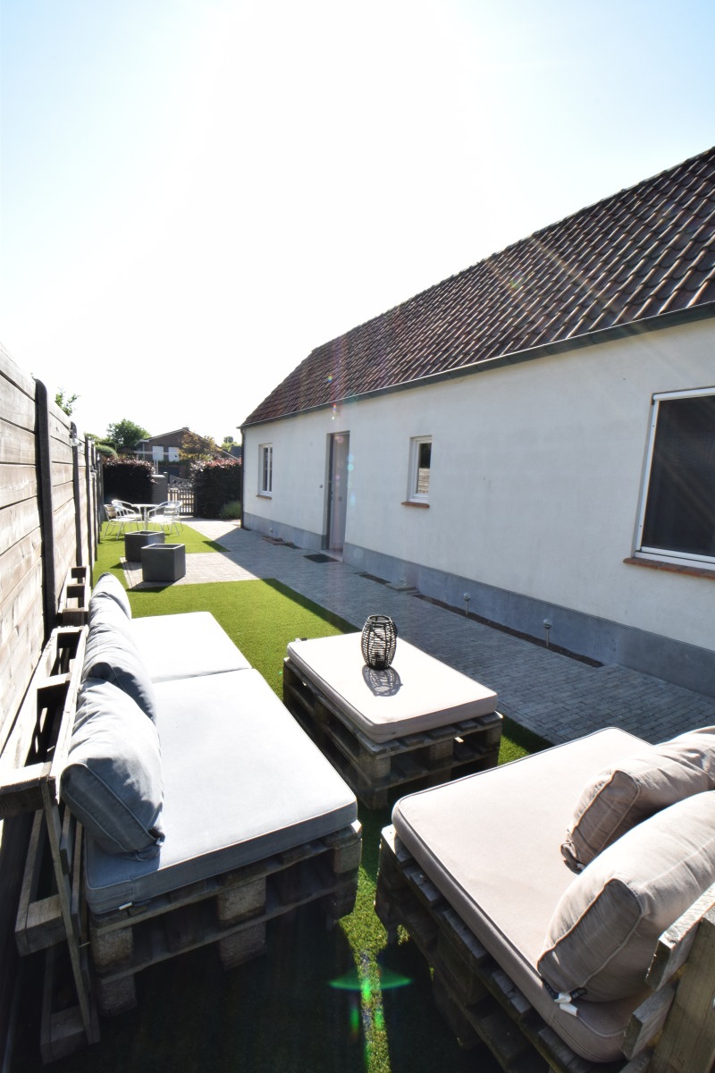 De tuin is zuidwest georiënteerd, volledig aangelegd, rechts van de woning is er een poort en links is een oprit met poort geplaatst.