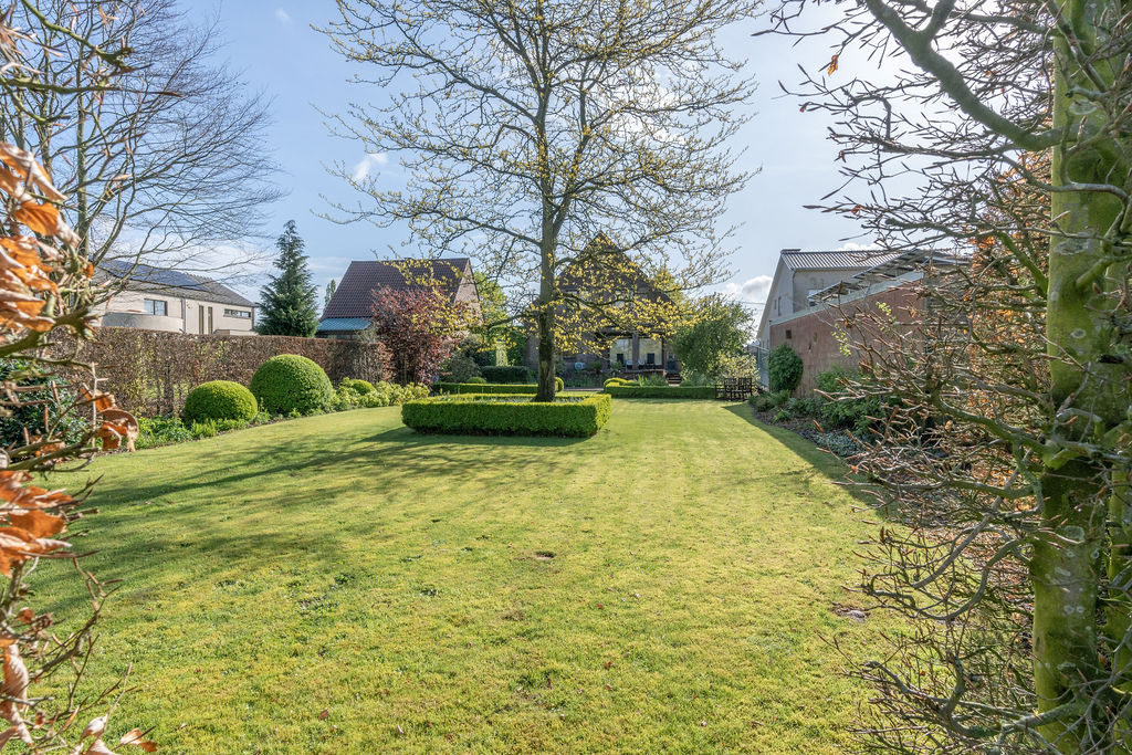 Een absolute troef is de prachtige tuin met vijverpartij en extra terras, prachtige bloemperken, hagen en centraal een karaktervolle boom, achteraan is er een tuinhuis geplaatst. De tuin is ook bereikbaar via de achterzijde.
