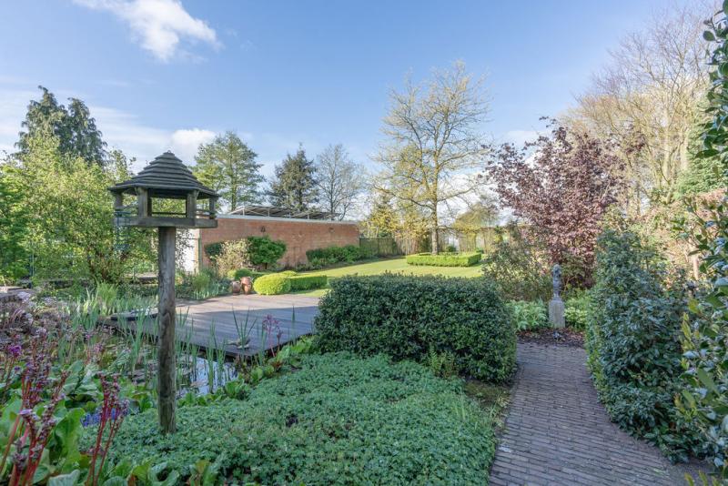 | Tuin | Prachtige tuin met volledig aangelegd met vijverpartij en terras, prachtige bloemperken, hagen en centraal een karaktervolle boom, achteraan is er een tuinhuis geplaatst |